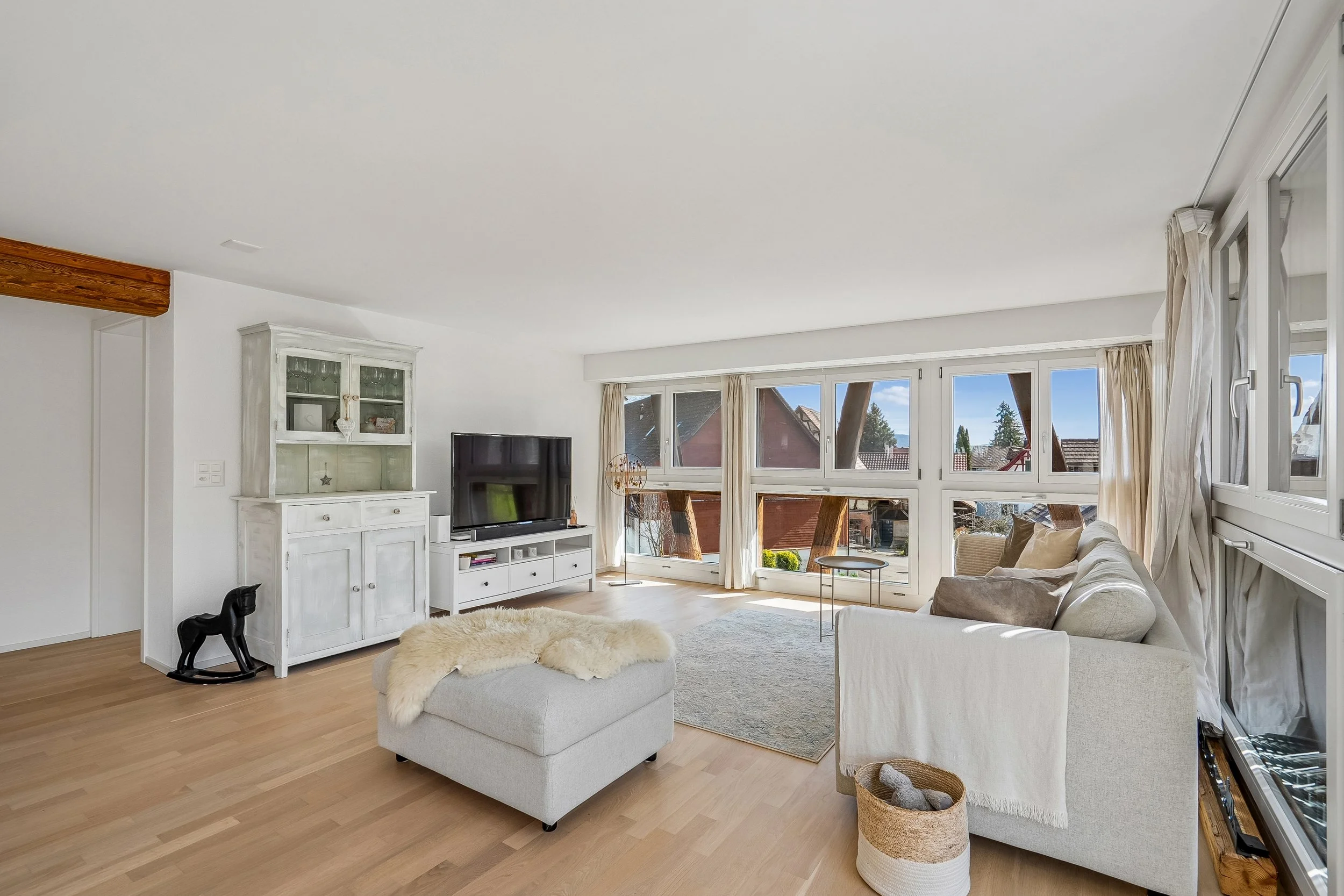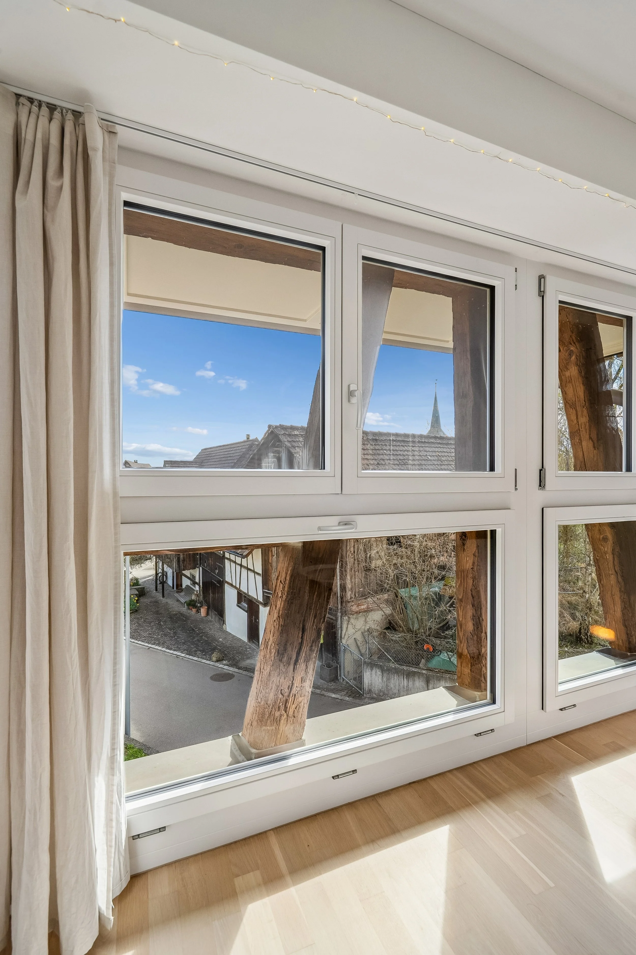 Der grosszügige Wohn- und Essbereich mit charakteristischem Fachwerk sorgt für ein warmes, heimeliges Raumgefühl. Parkett in den Wohnräumen und hochwertige Bodenplatten in Küche und Nasszellen unterstreichen die sorgfältige Materialisierung. Die moderne Küche sowie die eigene Waschmaschine und der Tumbler im Bad runden das durchdachte Raumkonzept ab.