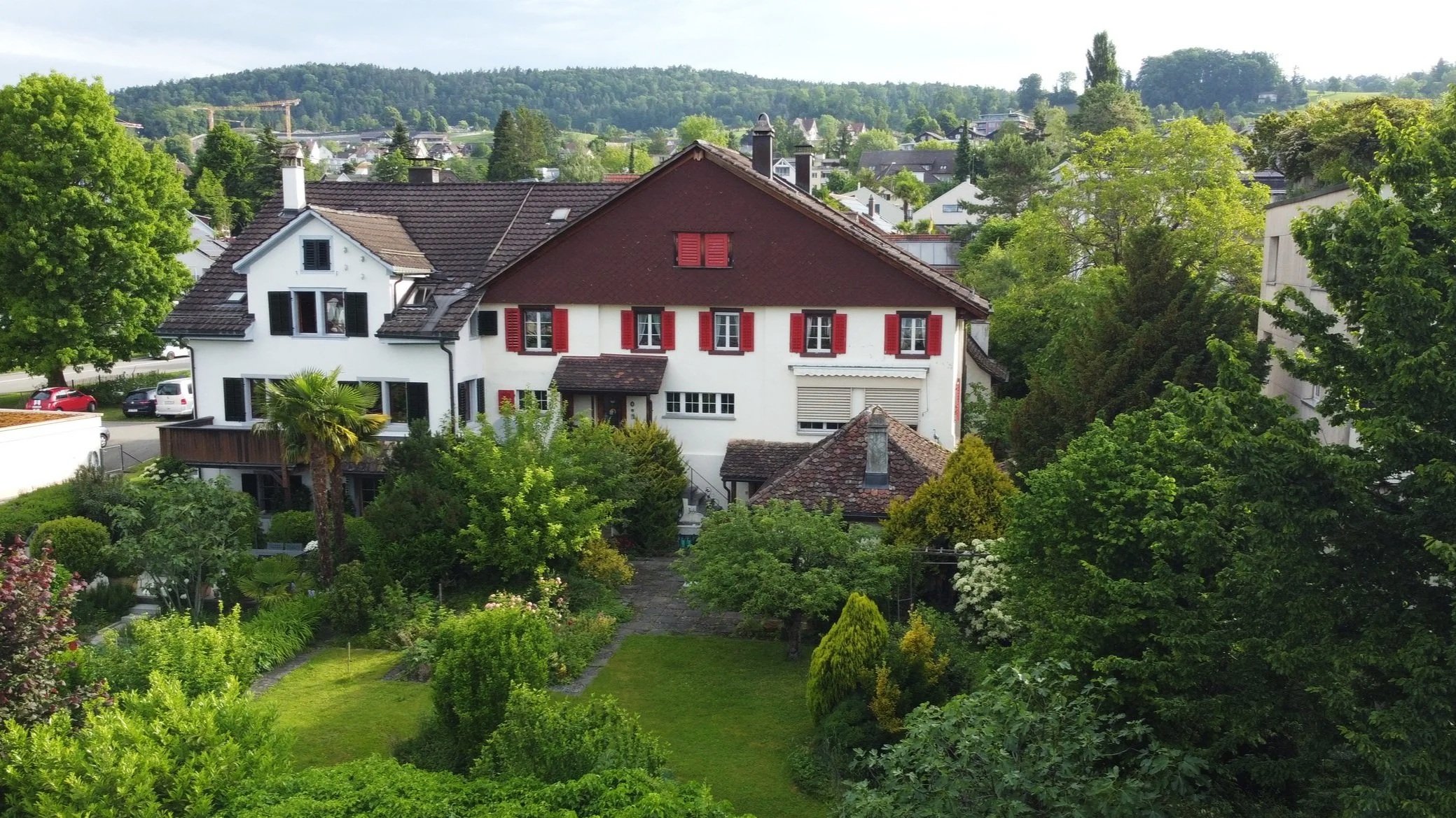 In einem gepflegten Quartier an sonniger und ruhiger Lage steht in unmittelbarer Nähe zur Naherholungszone ein stattliches, modernes Zweifamilienhaus mit unterirdischer Werkstatt und einem Autolift.